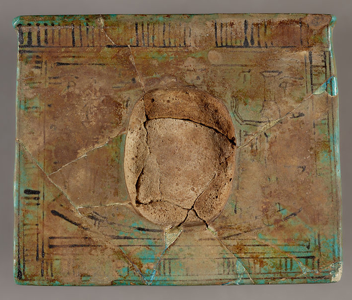 La boca está representada hacia abajo y los ojos grandes aun conservan las incrustaciones originales.